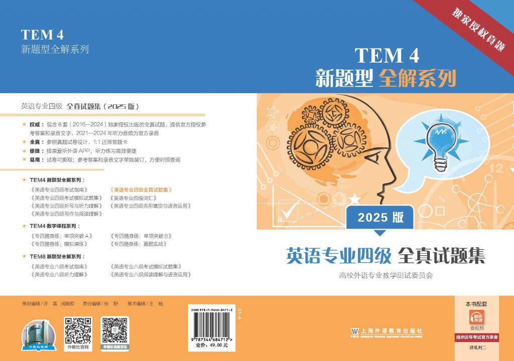 本书为 “TEM4:新题型全解系列”中的一本。2015年8月,高校外语专业教学测试办公室发布了《关于英语专业四级考试(TEM4)题型调整的说明》,从2016 年起对专四考试题型做了调整。为帮助英语专业学生熟悉新题型,高效备考,本书主要收录 2016-2024 年共8套(2020年因故未举办)英语专业四级考试真题及答案。每份试卷包括听力(听写、讲座和对话)、语言知识运用、完形填空、阅读理解、写作等部分,按照真实考试试卷体例编排,并附有参考答案和全真录音,为学生备考提供真题实战。